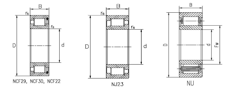 滿裝圓柱滾子軸承是為了承受重載荷而設計的。在同樣寬度下,這種軸承與傳統(tǒng)型帶保持架軸承相比,具有極高的承載能力,徑向截面小,可以節(jié)省空間,但轉速相對較低。為了使軸承正常工作,在連續(xù)運轉的情況下,軸承必須承受一定的最小負荷,即C/P<25。否則因潤滑不足和高速運轉時會加劇磨損。所有多列圓柱滾子軸承在外圈上有一潤滑槽和潤滑孔。