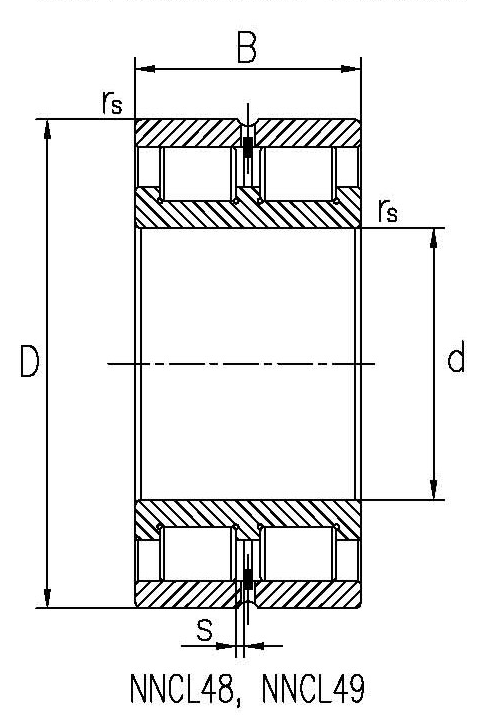滿裝圓柱滾子軸承是為了承受重載荷而設計的。在同樣寬度下,這種軸承與傳統(tǒng)型帶保持架軸承相比,具有極高的承載能力,徑向截面小,可以節(jié)省空間,但轉速相對較低。為了使軸承正常工作,在連續(xù)運轉的情況下,軸承必須承受一定的最小負荷,即C/P<25。否則因潤滑不足和高速運轉時會加劇磨損。所有多列圓柱滾子軸承在外圈上有一潤滑槽和潤滑孔。