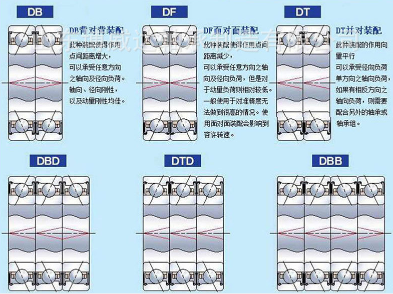 雙列角接觸球軸承能承受較大的徑向負(fù)荷為主的徑向和軸向聯(lián)合負(fù)荷和力矩負(fù)荷,限制軸的兩方面的軸向位移。主要用于限制軸和外殼雙向軸向位移的部件中雙列角接觸球軸承內(nèi)、外圈之間的可傾斜性有限,允許傾斜角取決于軸承的內(nèi)部間隙、軸承尺寸、內(nèi)部設(shè)計(jì)及作用于軸承上的力和力矩,而最大允許傾斜角應(yīng)保證軸承內(nèi)不會產(chǎn)生過高的附加應(yīng)力。若軸承內(nèi)、外圈之間存在傾斜角,將影響軸承的壽命,同時(shí)造成軸承運(yùn)轉(zhuǎn)精度下降,運(yùn)轉(zhuǎn)噪聲增大。雙列角接觸球軸承一般采用尼龍保持架或黃銅實(shí)體保持架。雙列角接觸球軸承安裝時(shí)應(yīng)注意,雖然軸承可承受雙向軸向載荷,但若一側(cè)有裝球缺口時(shí),則應(yīng)注意不要讓主要軸向載荷通過有缺口的一側(cè)溝邊。在軸承使用時(shí)應(yīng)注意使不帶裝球缺口的一側(cè)滾道承受主要載荷。