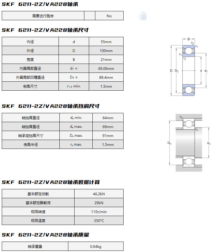 SKF 6211-2Z/VA228軸承屬于用于高溫應(yīng)用場(chǎng)合的單列深溝球軸承,需要進(jìn)行跑合:No。【可替換的NTN軸承為:NTN 6211F604軸承】