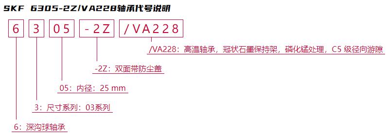 后綴列表:【-2Z:雙面帶防塵蓋】【/VA228:高溫軸承,冠狀石墨保持架,磷化錳處理,C5 級徑向游隙】。