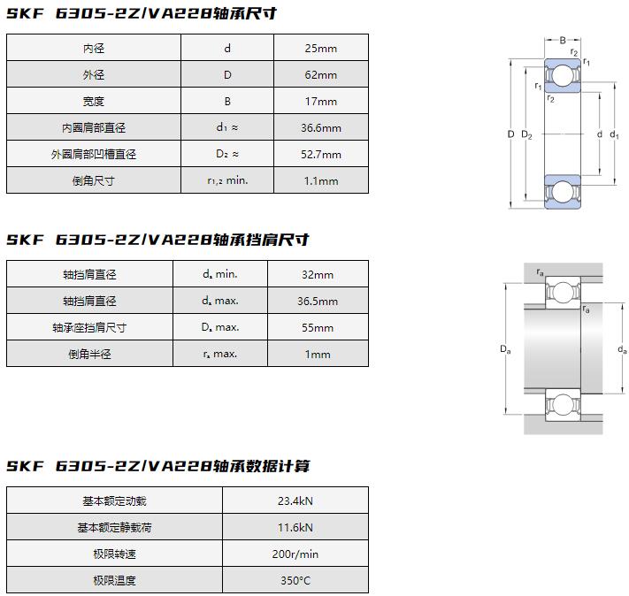 SKF 6305-2Z/VA228軸承屬于用于高溫應用場合的單列深溝球軸承,需要進行跑合:No。