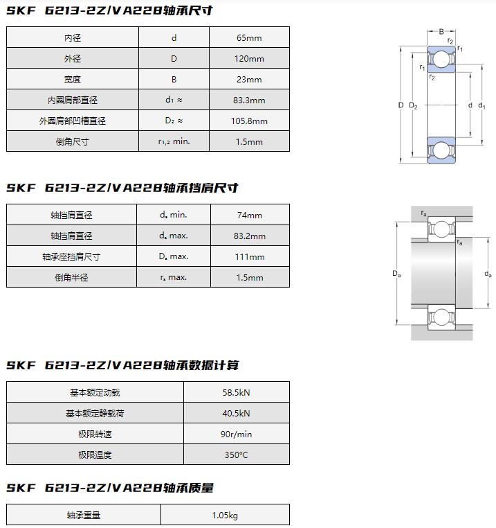 SKF 6213-2Z/VA228軸承屬于用于高溫應用場合的單列深溝球軸承,需要進行跑合:No。