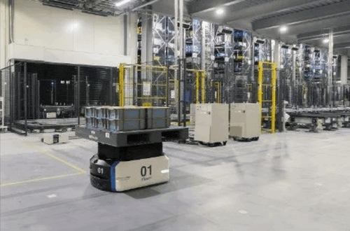 工序間無(wú)人運(yùn)輸車(chē)正在自動(dòng)搬運(yùn)產(chǎn)品